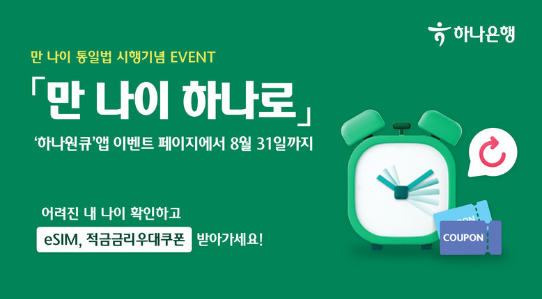 하나은행 손님지원본부 관계자는 “이번 『만 나이 하나로』 이벤트는 모든 손님이 공통된 주제로 함께 즐길 수 있도록 마련했다”며, “앞으로도 손님들과 더욱 적극적으로 소통하면서 더 많은 혜택을 드릴 수 있는 다양한 이벤트를 준비하도록 하겠다”고 밝혔다.