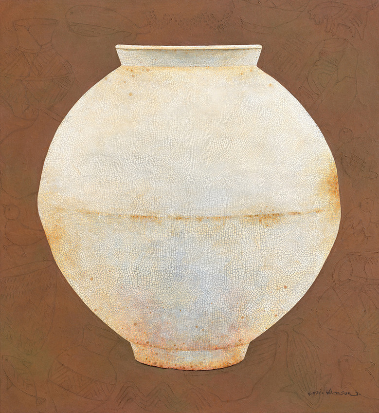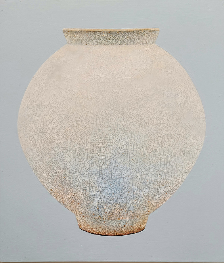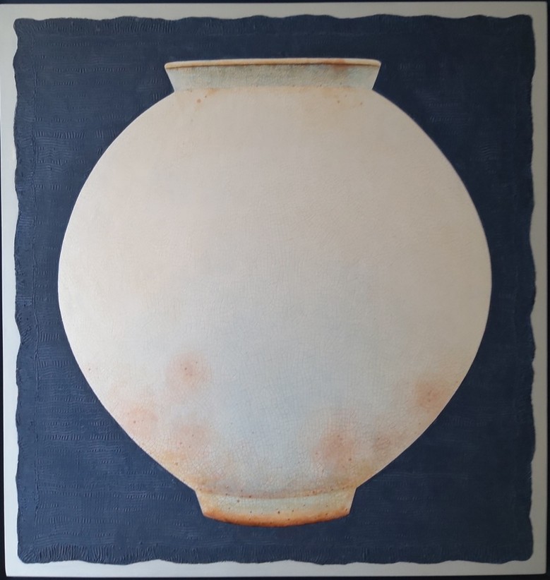 서양화 재료를 활용하여 전통 달항아리 형상의 이미지를 만들어 동서양의 혼합이라고 할 수 있다. 캔버스 위에 두께감 있게 재료를 입혀 저부조 형태를 띠고 있으며 좌우대칭의 균형미가 안정감을 전달한다. 달항아리 표면은 도자기처럼 매끈거리며 윤기 나고 자잘한 갈라짐(빙렬)이 구현되어 오래된 골동품을 보는듯하다. 재료의 특성에 따른 마름의 차이가 갈라짐을 만들고, 계산된 시차에 의해 선이 굵고 가늘게 만들어져 도자기의 느낌을 제대로 살렸다. 억지스럽지 않고 자연스럽게 표현된 도자기 그림의 형태가 조선의 예술정신까지 체감할 수 있게 해 준다.