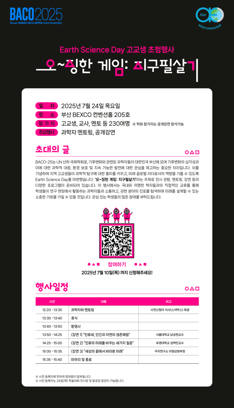 「기상·해양·빙권 국제학술대회(BACO-25)」는 ‘서로 연결된 지구(Our Interconnected Earth)’라는 주제로, 기후위기와 환경문제의 과학적 해법을 모색하고, 해양·대기·극지 과학의 최첨단 연구성과를 공유하는 세계 최고 수준의 학술 플랫폼이다.
