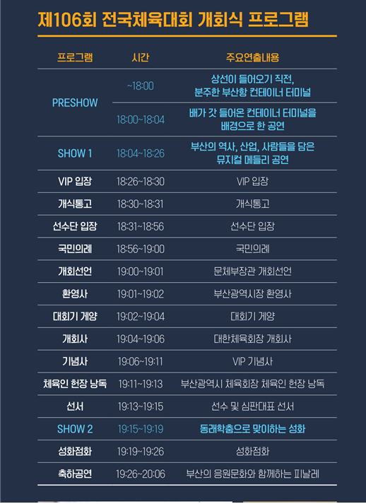 이후 ▲애국가 제창 ▲선수 및 심판단 선서 ▲문화체육관광부 장관의 개회 선언 ▲부산시장 환영사 ▲개회사 ▲기념사가 차례로 이어진다.