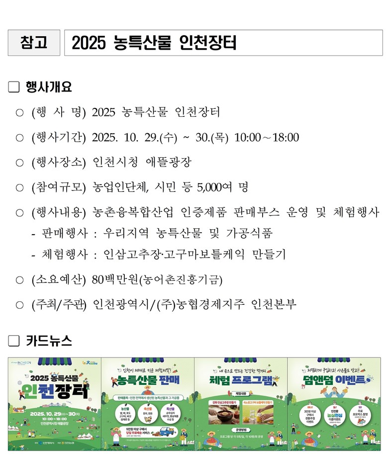 이번 행사는 인천시가 주최하고 ㈜농협경제지주 인천본부가 주관하며, 판로 확보에 어려움을 겪고 있는 지역 농특산물 생산 농업인을 지원하고 시민들에게 우수한 품질의 농특산물을 합리적인 가격에 제공하기 위해 마련됐다.