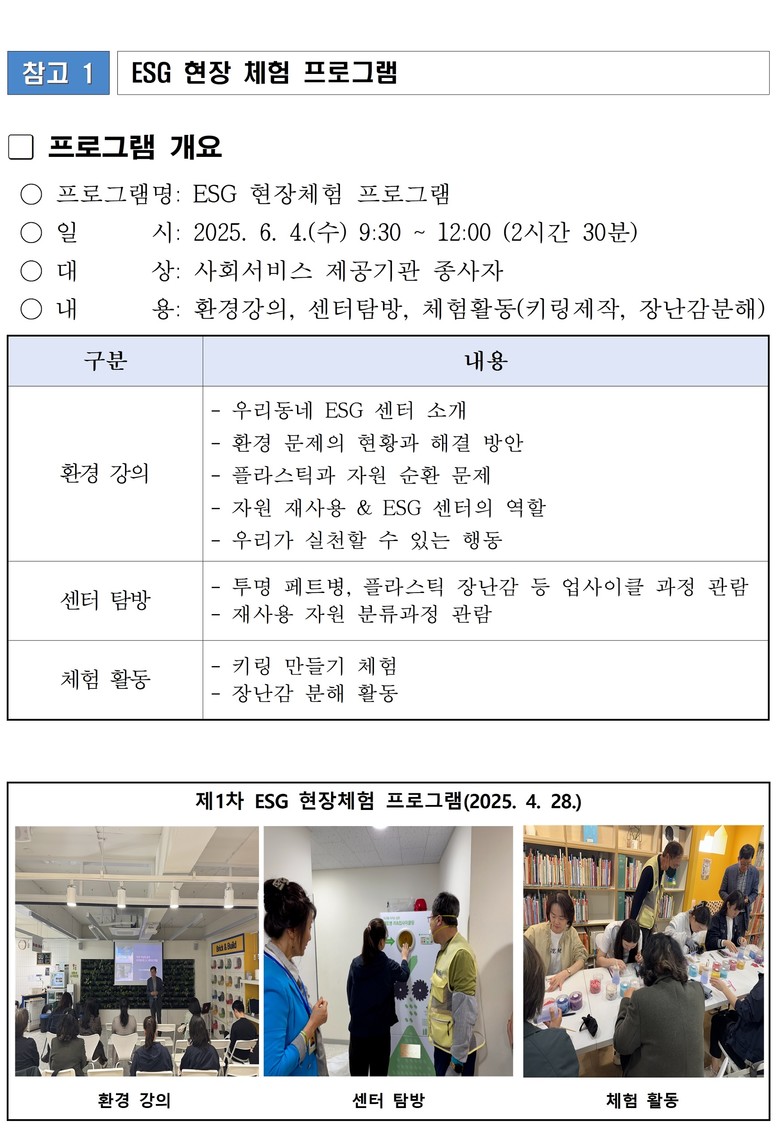 ◈ 6. 4.(수) 우리동네 ESG센터 1호점에서 ESG 실천에 관심있는 사회서비스 종사자를 대상으로 ESG 관련 환경 강의 · 센터 탐방 · 체험활동으로 진행 예정