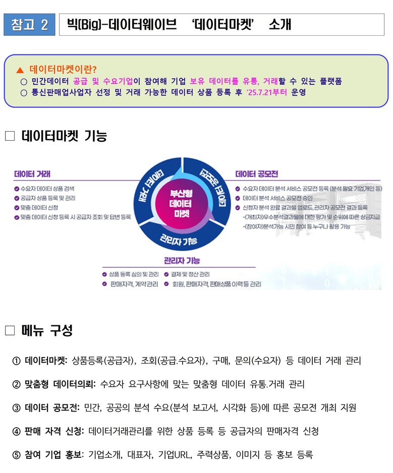데이터마켓 서비스를 제공하는 「빅(Big)-데이터웨이브」 운영은 전국 지자체에서는 최초 사례로, 지역의 데이터 산업 발전과 민관 협업 기반의 데이터 중심(허브) 역할을 함으로써 '데이터로 도약하는 디지털 경제도시 부산' 구현에 앞장선다.