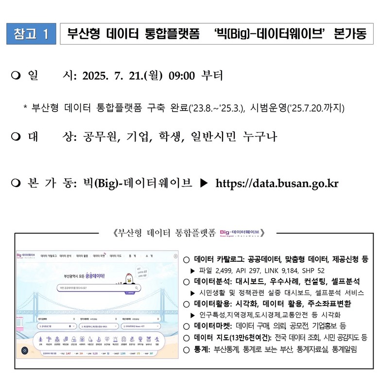 부산형 데이터 통합플랫폼은 지난해(2024년) 6월, 시민공모를 통해 ‘빅(Big)-데이터웨이브’ 명칭을 선정하고 데이터저장소, 분석서비스, 대시보드 등 포털 서비스를 개시했다. 이후 올해 3월 데이터마켓, 데이터 통합지도 등 2단계 사업을 완료한 후, 4월부터 학생, 기업, 공무원 등 사용자 테스트와 시범운영을 거쳐 오늘(21일)부터 본격 운영에 들어간다.