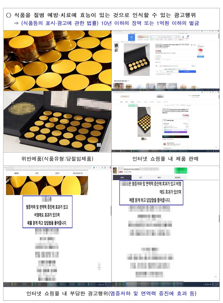 ‘가’ 업소는 자사가 제조·판매하는 기타가공품을 온라인 누리집에 홍보하며 ‘심장, 혈관, 고혈압, 지방간에 도움’ 등 질병 예방·치료 효과가 있는 것으로 오인할 수 있는 문구를 사용했다. 이 광고를 통해 최근 1년간 해당 제품 246박스를 판매해 약 2천400만 원의 매출을 올렸다.