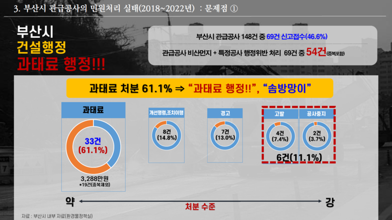 * 2018~2022년 부산시 관급공사 민원처리 실태 : 부산시 관급공사 148건 중 69건 신고접수(46.6%) ** 총 69건 중 54건(중복포함)이 행정위반, 과태료(33건, 61.1%) > 개선명령(8건, 14.8%) > 경고(7건, 13.0%) > 고발(4건, 7.4%) > 공사중지(2건, 3.7%) 순 |