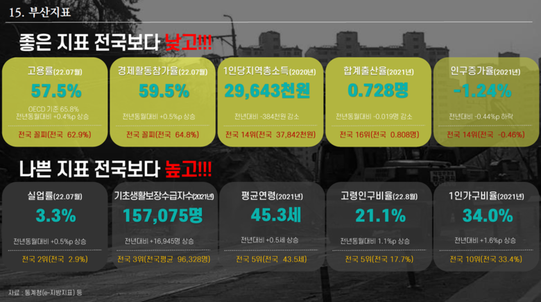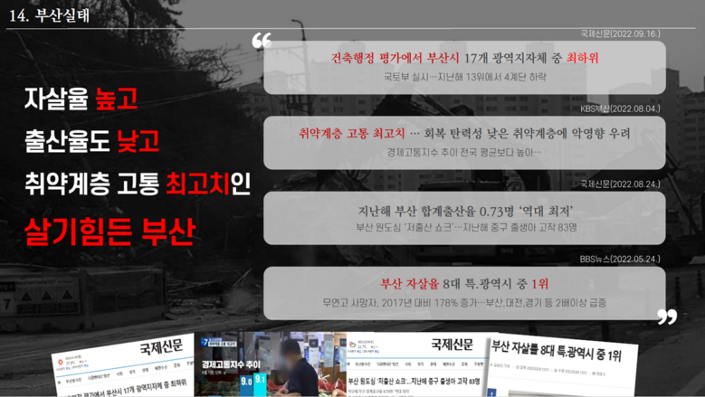 마지막으로 답변에 나선 이병진 부시장에게는 현재 부산의 민생, 경제와 관련된 각종 지표가 전국 최하위를 기록하고 있다고 지적하였다. 이에 더해 3년 이상 지속된 코로나 팬데믹으로 인하여 부산시민 삶은 갈수록 피폐해지고 있다고 문제 삼고 나섰다. (PT 14~15)