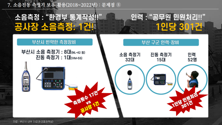 또한, 부산시는 관급공사 등 소음 등에 관리를 위한 ‘소음·진동 측정기’는 겨우 8대, 1대로, 시민의 소음과 진동 민원 대응에 측정장비는 턱없이 부족하고, 그나마 보유한 소음·진동 측정기는 환경부에 매년 제출하는 통계작성을 위한 용도 정도로만 사용되는 실정이라고 지적했다. 공사장과 관련한 소음·진동 측정 실적은 5년 동안 소음측정은 ‘0건’으로 전무하고, 진동 측정은 단 1건에 불과했다고 지적했다.