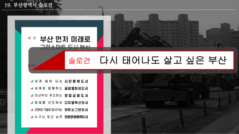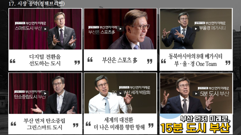 이에 오랜시간 관행으로 포장되어 이어져 온 부산시의 여러 부실한 시정에 대해서는 지금이라도 과감하게 개선하고 버릴 것을 주문하면서, 부산시민에게 가장 필요한 ‘시민 중심의 기본행정’을 정립하여 강력하게 추진해 나갈 것을 당부하였다. (PT 16~22)