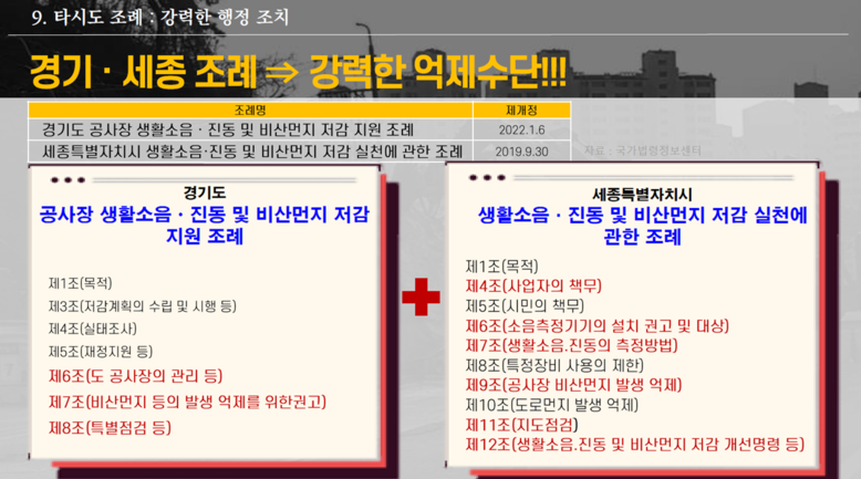 다음으로 제도적 조치로는 광역 시.도에서 공사장의 생활소음과 진동, 비산먼지로부터 도민과 시민을 보호하기 위한 지원조례를 만들고 있음을 설명하였다. 이에 박 의원은 지금이라도 부산시민을 보호하기 위한 적극적인 제도마련이 필요하다고 강력히 주장하였다. (PT 8~10)