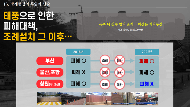 한편, 박 의원은 부산시의 부실한 행정은 비단 건설행정뿐만 아니라 침수와 같은 방재행정에서도 드러났다고 지적하였다. 부산시의회 주도로 차수막과 관련한 침수 방지시설 조례를 광역자치단체 최초로 제정하였지만, 조례 제정 이후 5년간(2018~2022년) 예산을 전혀 편성하지 않아, ‘부실 방재행정’관행에서 벗어 나지 못한다고 강력히 질타하였다. (PT 11~12)