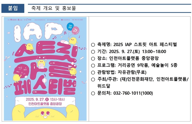 < IAP 스트릿 아트 페스티벌 >의 모든 거리공연과 예술놀이 프로그램은 사전 신청 없이 무료로 즐길 수 있으며, 자세한 정보는 인천아트플랫폼 홈페이지(www.inartplatform.kr)에서 확인할 수 있다.