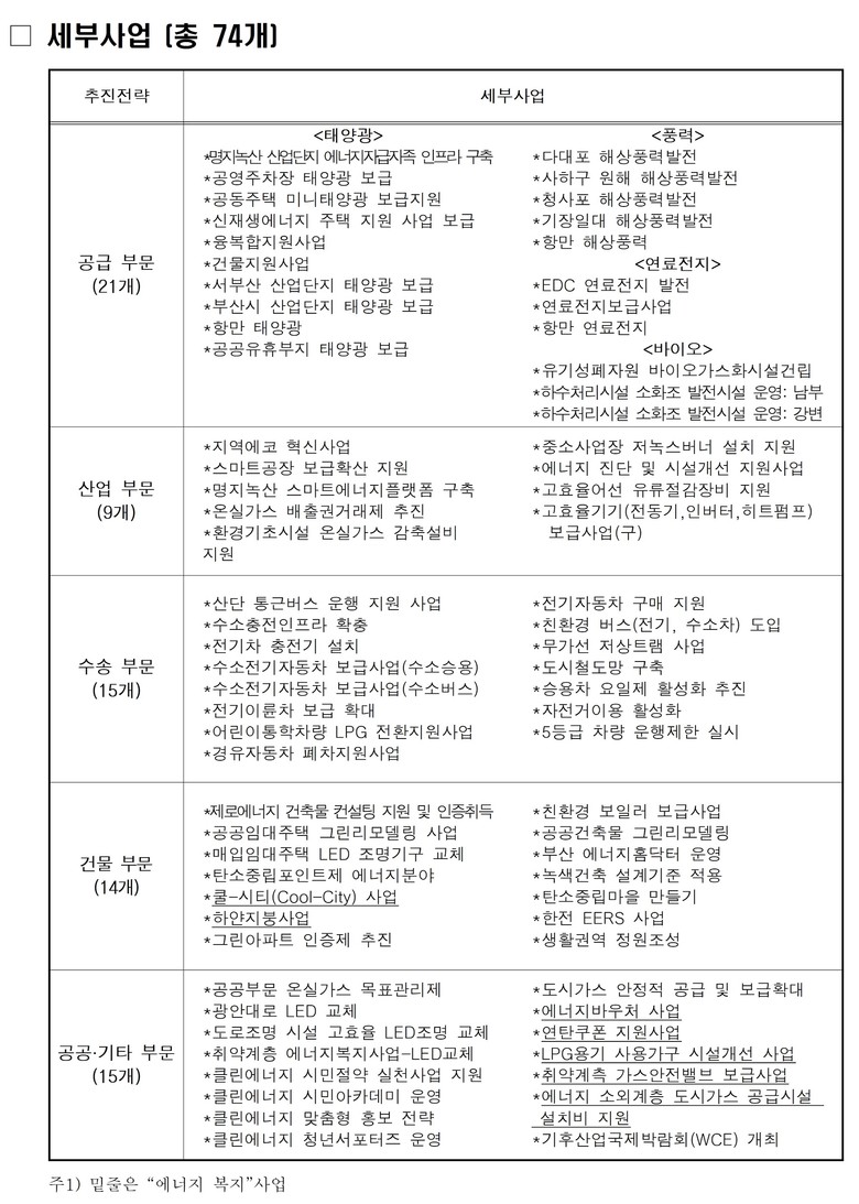 [에너지 수요관리부문] 산업 및 건물 부문의 합리적인 에너지 절감을 위해 시설개선 지원사업과 에너지 진단을 추진하고, 시민 대상 교육·홍보와 시민참여형 발전사업을 통해 시민주도의 에너지 전환을 확대할 계획이다. 또한 에너지바우처 지원사업 등 취약계층을 위한 에너지 복지사업을 실시하고, 다양한 에너지 산업 육성을 통해 지역경제 활성화를 도모할 예정이다.