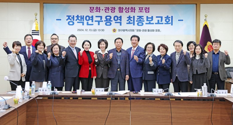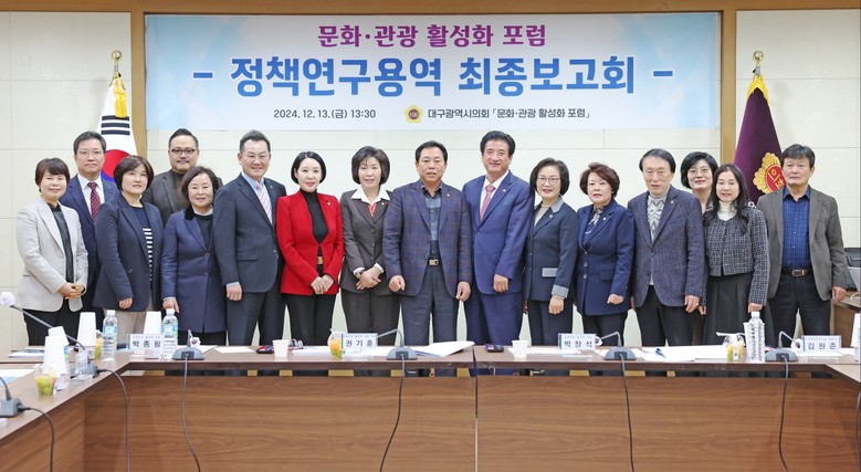 [대구 세계타임즈=한윤석 기자] 대구시의회 의원연구단체 ‘문화ㆍ관광 활성화 포럼’(대표 권기훈 의원)은 12월 13일(금), 의회 3층 회의실에서 소속 의원이 참석한 가운데 ‘대구아리랑 문화ㆍ관광 활성화 방안’과 ‘생활인구 증가를 위한 체류형 관광지 조성방안 연구’ 용역 최종 보고회를 개최했다.