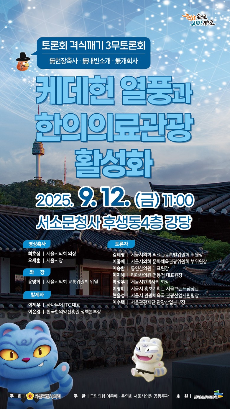 이번 토론회는 넷플릭스 드라마 케데헌의 세계적 인기를 계기로 케이메디(K-Medi) 브랜드를 강화하고 서울시 의료관광 산업 발전 방안을 모색하기 위해 마련됐다.