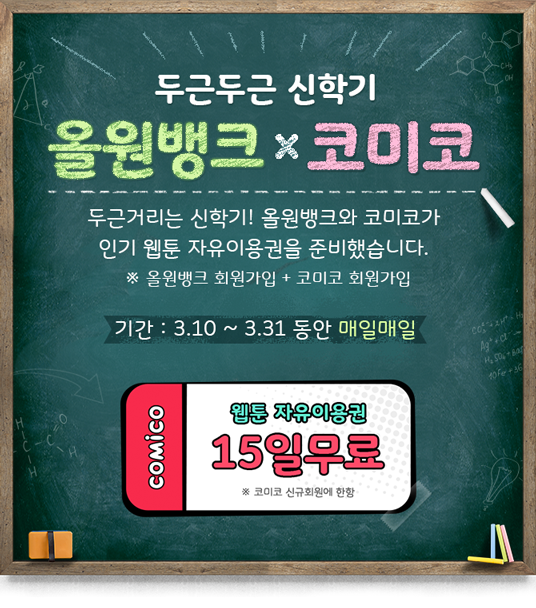 이번 이벤트는 '올원뱅크×코미코' 공동마케팅 행사로, 10일부터 31일까지 올원뱅크에 신규로 가입하는 고객 모두에게 코미코의 웹툰 15일 자유이용권을 제공한다.