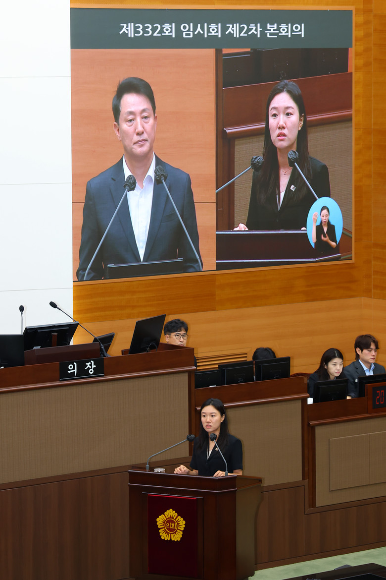 사과 의향을 묻는 질문에는 한동안 머뭇거리며 “법적으로 사과하려면 고의나 과실, 주의의무 위반이 있어야 한다”며 선을 그었다. 이 의원이 “청년 임차인들은 서울시 브랜드를 믿고 입주했다. 시장으로서 최소한 ‘송구하다’ 한마디라도 할 수 있지 않느냐”고 거듭 묻자, 오 시장은 짧게 “송구스럽게 생각한다”고 답했다. 이 의원은 “간담회 현장에서 사과 한마디라도 했더라면 큰 위로가 됐을 것”이라고 지적하자, “사실관계를 먼저 설명해야 했기 때문에 그럴 수 없었다”고 반박했다.