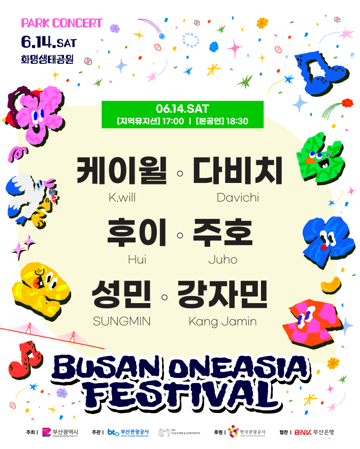 ◈ 공연은 17:00부터 시작하며, ▲케이윌 ▲다비치 ▲후이 ▲주호 등 대중가수와 지역 뮤지션 출연 예정… 누구나 무료로 관람 가능 [부산 세계타임즈=이용우 기자] 부산시(시장 박형준)는 2025 부산원아시아페스티벌(Busan One Asia Festival, 이하 BOF)의 「2025 비오에프(BOF) 파크콘서트(이하 콘서트)」를 오는 6월 14일 오후 5시에 화명생태공원에서 무료로 개최한다고 밝혔다.
