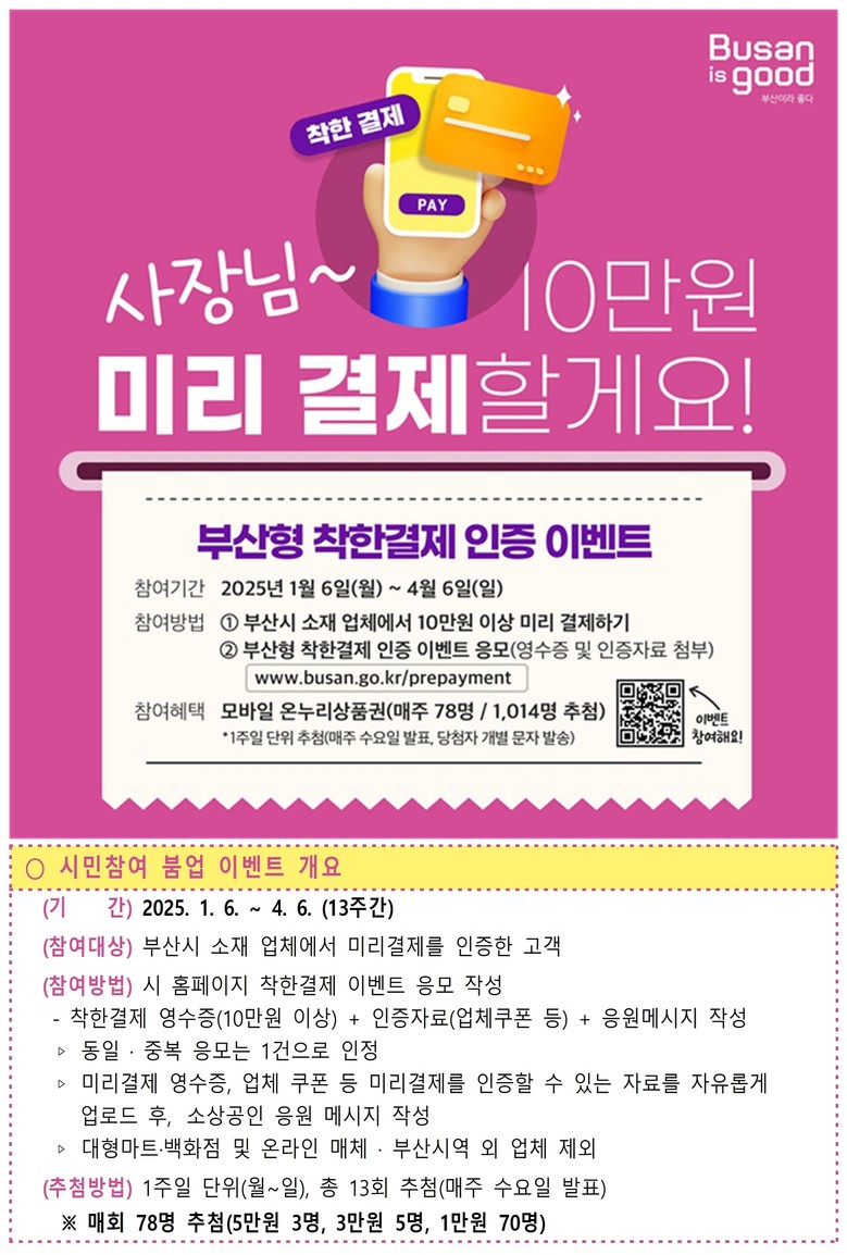 민간기업의 「부산형 착한결제 캠페인」은 지역 단골 식당, 카페 등 소상공인 점포에서 미리 결제하고 재방문을 약속하는 방식으로 2월까지 진행된다.