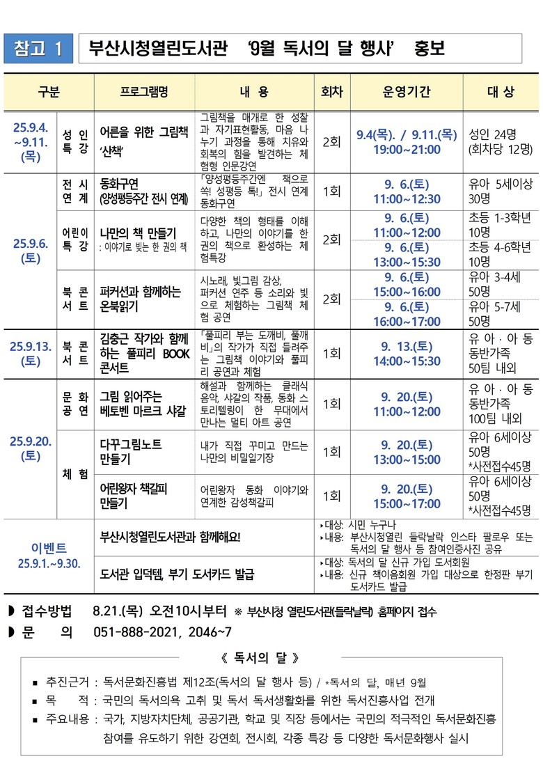 자세한 사항은 부산시청열린도서관 들락날락 누리집(library.busan.go.kr/openlib)에서 확인할 수 있으며, 사전 접수는 8월 21일 오전 10시부터 온라인으로 선착순 진행된다.