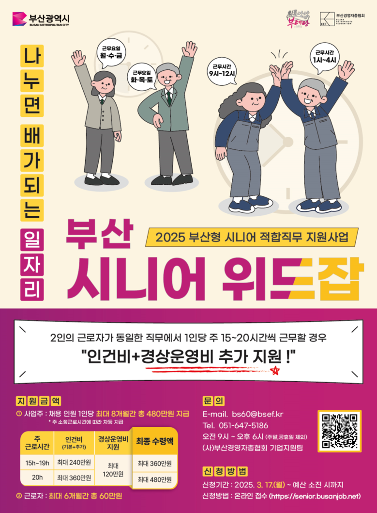 이번 사업은 시가 선정한 '부산형 장년(시니어) 적합 직무' 분야에 60세 이상 구직자를 채용할 시, 채용 인원 1인당 매월 최대 60만 원씩 8개월간 총 480만 원의 인건비 일부를 기업에 지원한다.