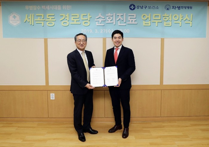 | ▲자생한방병원 이진호 병원장(오른쪽)과 강남구 정순균 구청장(왼쪽)이 지난 27일 세곡동 한방 순회진료 업무협약을 맺고 기념촬영을 하고 있다. |