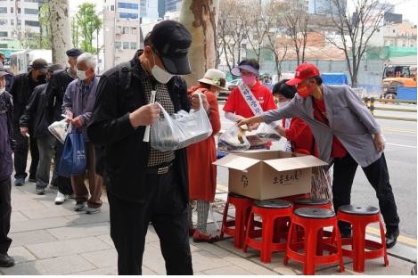 [세계타임즈 = 이채봉 기자] 허경영 전)국가혁명당 대통령 후보가 대표인 (재)하늘궁 무료급식소는 한파(寒波)에도 종로 3가 탑골공원 뒤 낙원상가 입구에서 연중무휴 매일 500명분의 도시락을 어르신들에게 나눠주고 있다.