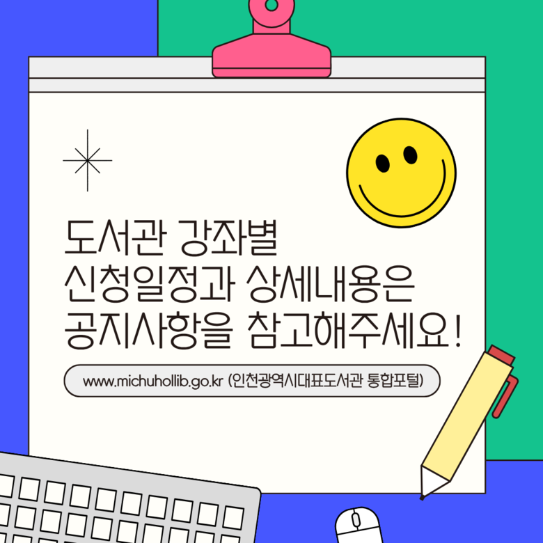 인천 시민이면 누구나 신청할 수 있으며, 강좌별 모집 인원은 12~20명 내외다. 모든 강좌는 무료로 운영되나, 교재비와 재료비는 수강생 부담이다. 수강 신청 일정은 도서관별로 다르므로 자세한 사항은 인천시 대표도서관 통합누리집(www.michuhollib.go.kr)에서 확인하면 된다.