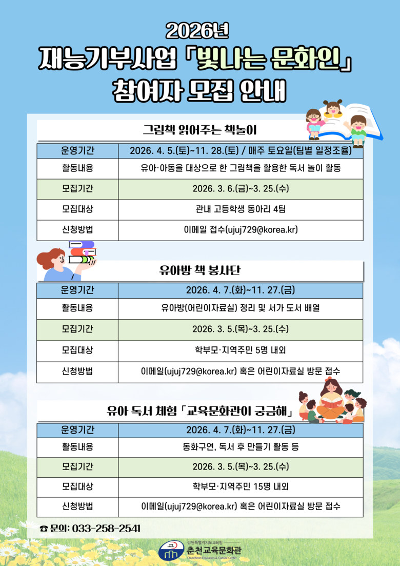 자세한 사항은 춘천교육문화관 누리집 공지사항을 참고하거나 자료실(☎ 033-258-2541)로 문의하면 된다.