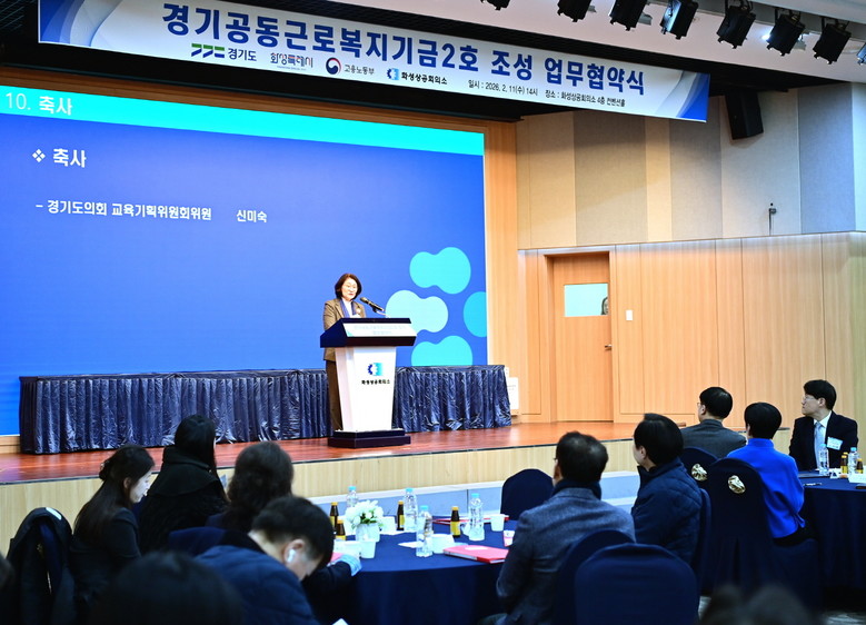 [경기도 세계타임즈=송민수 기자] 경기도의회 교육기획위원회 신미숙 의원(더불어민주당, 화성4)은 11일(수), 화성상공회의소에서 열린 「경기공동근로복지기금 2호 조성 업무협약식」에 참석해 축사를 통해 노동자의 복지혜택의 중요성을 강조했다.