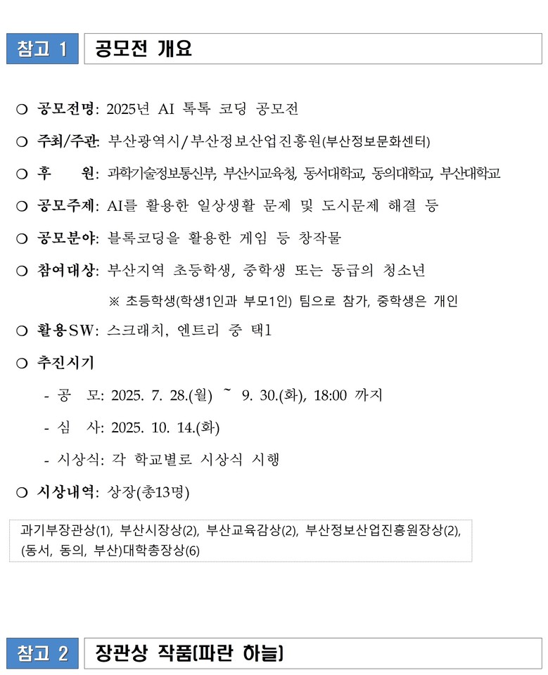 ◈ 초등부 40건, 중등부 37건, 총 77건의 다양한 작품 접수돼… 과학기술정보통신부장관상, 부산광역시장상 등 총 13개의 우수작품 선정 [부산 세계타임즈=이용우 기자] 부산시(시장 박형준)는 청소년의 디지털 역량 강화와 건전한 정보문화 확산을 위해 추진한 「2025년 인공 지능(AI) 톡톡 코딩 공모전」의 수상자를 선정했다고 밝혔다.