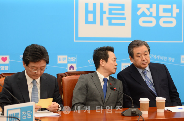 바른정당 김무성(오른쪽) 의원이 남경필 경기도지사와 20일 오전 서울 여의도 국회에서 열린 최고위원·중진의원 연석회의에서 대화를 나누고 있다. 왼쪽은 유승민 의원. 2017.02.20.