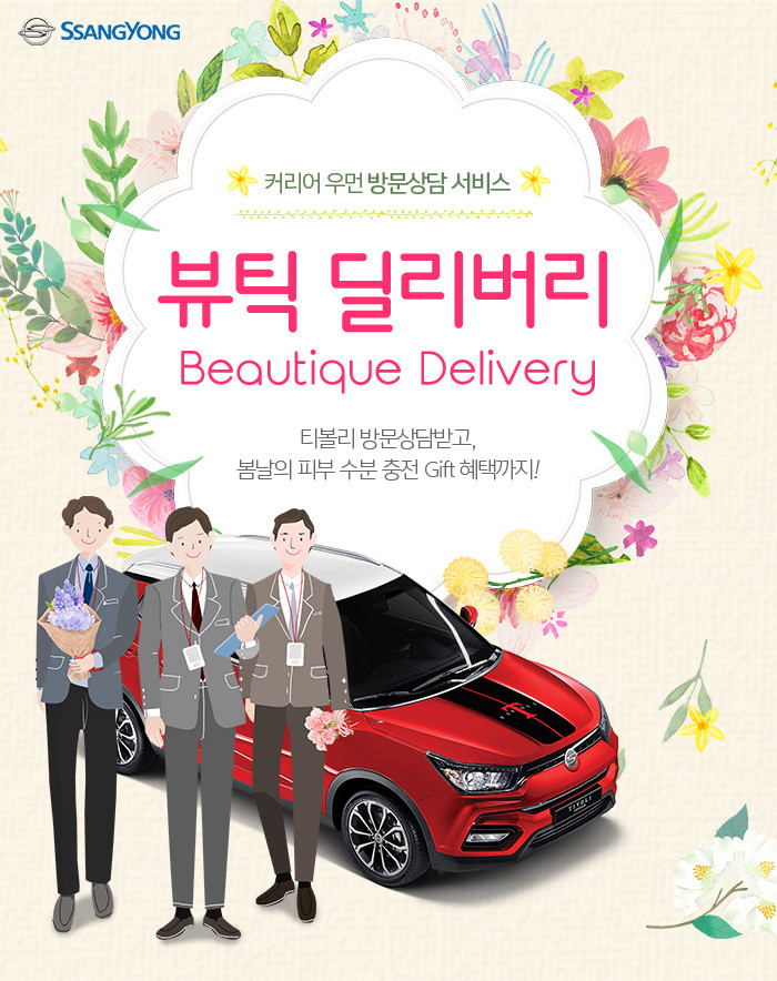 쌍용차는 바쁜 직장생활로 전시장을 내방하기 어려운 여성고객들을 위해 5월 한 달 동안 오토매니저가 피부관리를 위한 마스크팩과 함께 직접 방문·상담하는 ‘뷰틱 딜리버리(Beautique¹ Delivery)’를 진행한다(¹아름다움을 뜻하는 Beauty와 부티크Boutique의 조합).