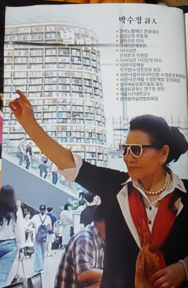 이렇듯 우주를 품은 여인은 그 유명하신 국화옆에서의 시성 미당 서정 주시인께서 영성 박수정 시인을 꽃의 어머니라 부르셨음을 오늘 새롭게 느끼며 작가님의 간추린 활동 몇 개만 펼쳐드립니다.
