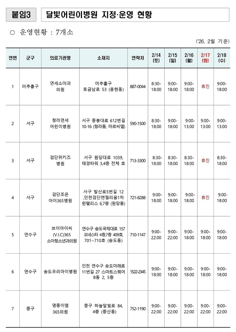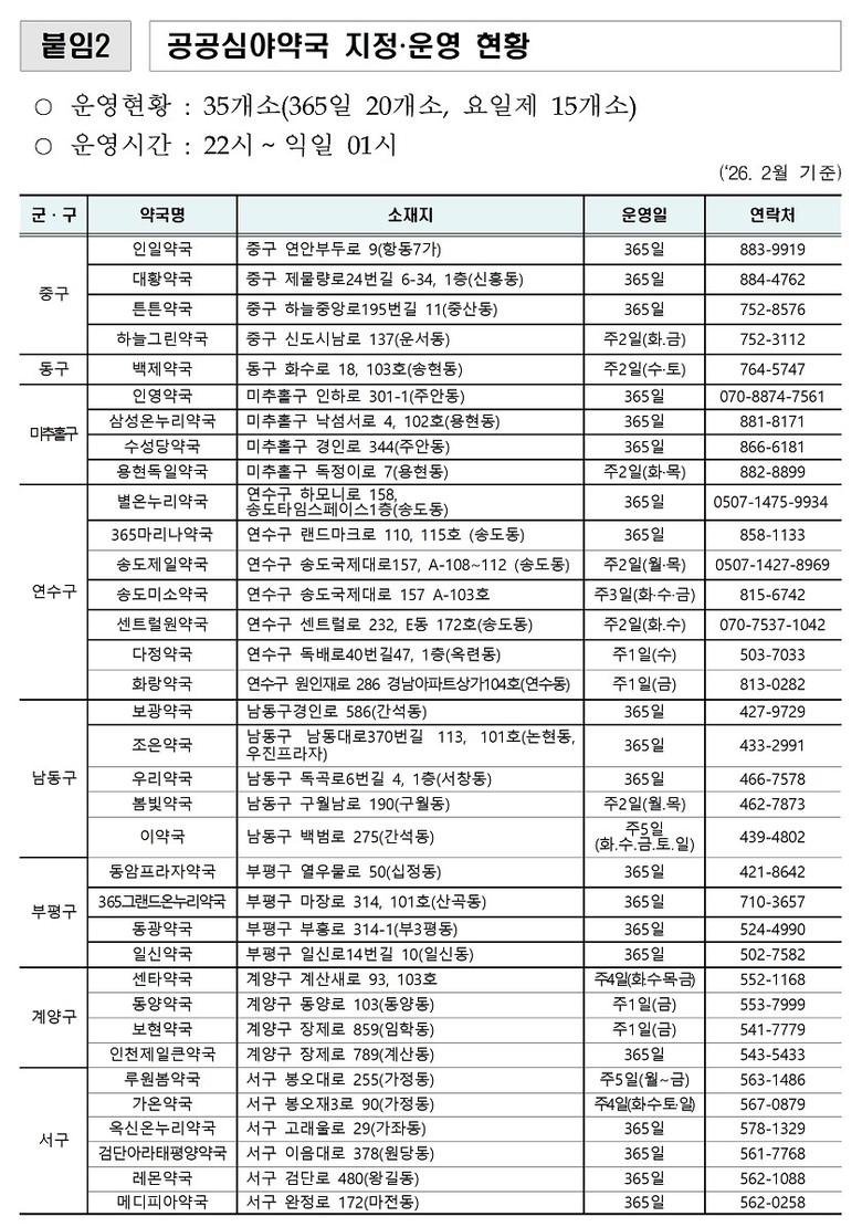 신병철 시 보건복지국장은 “설 연휴 기간 의료 공백과 시민 불편을 최소화해 모두가 안전하고 편안한 명절을 보낼 수 있도록 최선을 다하겠다”며, “병·의원이나 약국을 방문할 경우 반드시 사전에 운영 여부를 확인해 주시기 바란다”라고 당부했다.