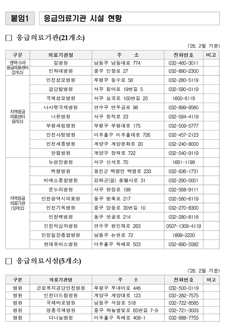연휴 기간 문을 여는 병·의원과 약국 정보는 응급의료포털 ‘e-gen’을 통해 확인할 수 있으며, 120 미추홀콜센터, 119 구급상황관리센터, 129 보건복지상담센터를 통해서도 안내받을 수 있다.