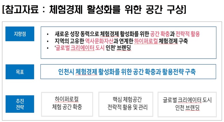 인천시는 체험경제와 연계한 ‘하이퍼로컬(건물)’과 ‘하이스트리트(거리/거점)’를 발굴하고, 이들을 잇고 연계하면서 핵심 거점들을 활성화하는 전략을 적극적으로 전개해 나가야 한다. 또한 도시 차원에서 ‘크리에이티브 도시’로 브랜딩하는 노력도 필요하다.