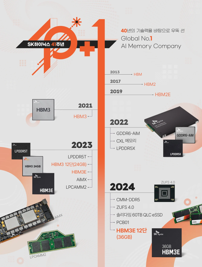 이처럼 AI라는 거대한 흐름의 선두에 선 SK하이닉스는 지난 역사를 바탕으로 또 한 번의 도약을 준비하고 있다. 41주년을 맞은 회사는 HBM 1등 확고한 리더십으로 차세대 반도체 시장에서도 주도권을 확보, 모든 제품이 AI의 핵심 동력으로 작동하는 ‘The Heart of AI’ 시대를 선도해 나가고자 한다.