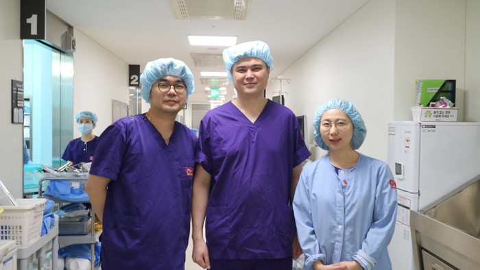 | ▲지난 3월 H+양지병원 교육 실습 중인 부르쟌 쿠아느시바에프(사진 중앙), 해외의료진 교육을 주관한 배병구 H+양지병원 종양외과센터장(사진 왼쪽) |