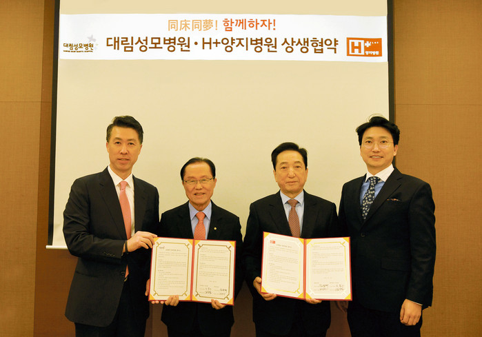 | ▲대림성모병원과 H+양지병원은 23일 상생을 위한 협약을 체결했다. 왼쪽부터 대림성모병원 김성원 원장·김광태 이사장, H+양지병원 김철수 이사장·김상일 원장 |