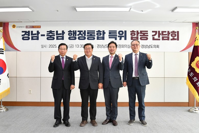 [충남 세계타임즈=이현진 기자] 충남도의회 ‘충남대전 행정통합 특별위원회(위원장 신영호)’는 21일 경상남도의회를 방문해 ‘부산경남 행정통합 특별위원회(위원장 허용복)’와 합동 간담회를 갖고, 행정통합추진 전략과 초광역 협력 확대 방안을 논의했다.