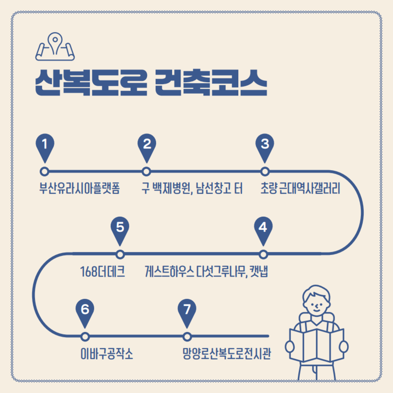 ○ [산복도로건축 코스] 부산유라시아플랫폼, 구 백제병원, 게스트하우스 ‘다섯그루나무’와 ‘캣냅’, 그리고 경사형 엘리베이터를 타고 올라가 보는 168더데크, 이바구공작소, 망양로산복도로전시관 등을 탐방하며, 글로벌 허브 항구도시 부산의 매력을 듬뿍 느낄 수 있다.