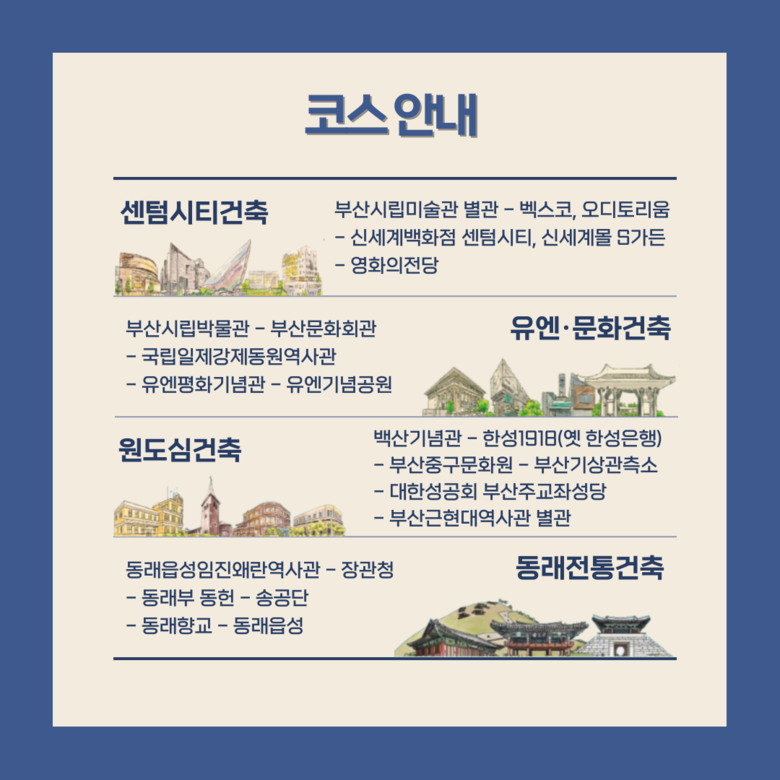 ◈ 코스는 ▲센텀시티건축(해운대구) ▲유엔·문화건축(남구) ▲원도심건축(중구) ▲동래전통건축(동래구) ▲산복도로건축(동구)…도보 약 2시간 30분 소요, '부산건축문화해설사' 동행