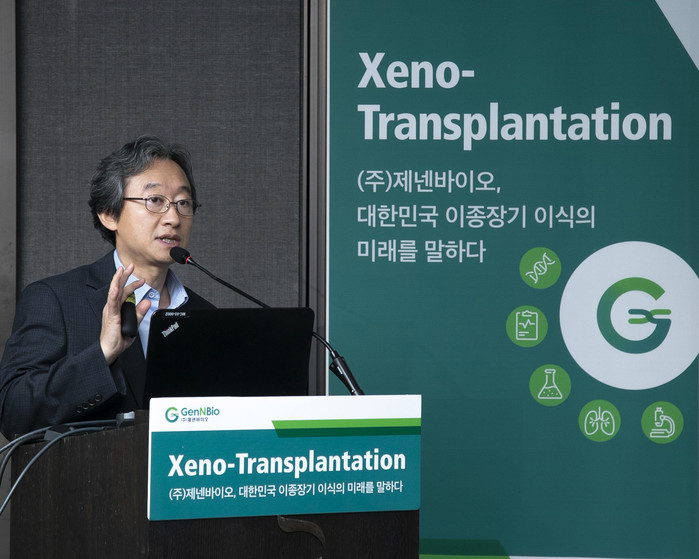 | ▲㈜제넨바이오 주최 ‘Xeno-transplantation(이종이식)’ 기자간담회에서 바이오이종장기개발사업단 박정규 단장이 발표하고 있다. |