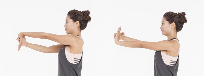 이 같은 경우에는 손목 당기기가 효과적이다. 우선 한 쪽 팔을 앞으로 뻗어 손끝을 아래로 해준다. 반대편 손으로 뻗은 손을 눌러 몸 안쪽으로 15초간 당겨준다. 이후 손을 바꿔 실시해주면 된다.