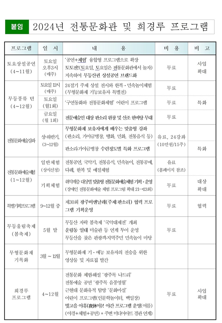 광주광역시(시장 강기정)는 무형유산 전승공간이자 전통문화예술의 산실인 ‘전통문화관’과 도심 속 전통 누각인 ‘희경루(喜慶樓)’의 2024년 운영계획을 확정했다.