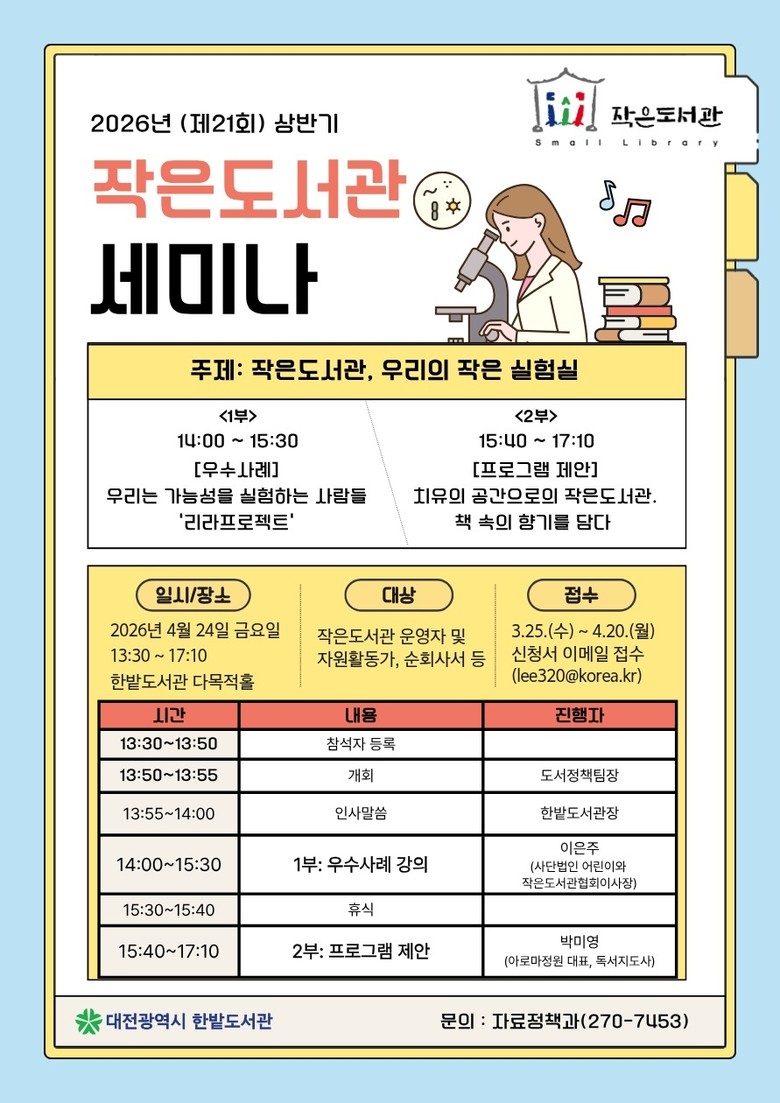 이번 세미나는 ‘작은도서관, 우리의 작은 실험실’을 주제로 진행된다. 1부에서는 작은도서관 역할 확장에 대한 우수사례를 공유하고, 2부에서는 문학과 향을 결합한 치유형 프로그램을 소개하는 등 현장 중심의 우수사례와 새로운 운영 방향을 제시할 예정이다.