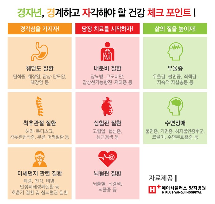 물론 국가건강검진을 통해 기본적인 건강 상태를 점검할 수 있고, 기저 질환에 대한 관리도 가능하지만 별다른 자각증상이 없거나 기초 검사에서 확인되지 않는 질병도 많다. 췌담도 질환은 진단 과정이 복잡해 발견이 어렵고, 일상 속 익숙해진 척추관절 및 미세먼지 질환 등은 방심하기 쉽다. 또한 노년층의 전유물로 여겨졌던 심뇌혈관 질환은 30~40대 젊은 층도 안심할 수 없게 됐고, 최근 급증하고 있는 우울증, 수면장애 등 삶의 질을 좌우하는 질환에 대한 관심도 늘어나는 추세다. 따라서 건강한 경자년(庚子年)을 보내고 싶다면 올해 만큼은 평소 놓치기 쉬웠던 질병들을 ‘경계하고 자각’하며 경쟁력 있는 자기 몸 만들기를 위해 꼼꼼하게 챙겨보자!