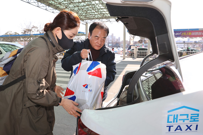 | ▲ < 2023. 3. 3.(금) 이만규 대구시의회 의장 대구로택시 일일기사 체험 > - 대구국제공항에서 승객을 도와 짐을 트렁크에 싣는 모습 |