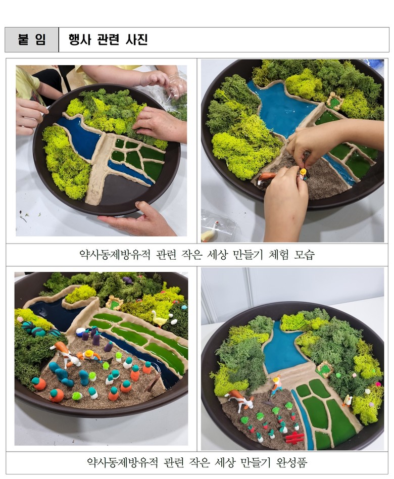 이어 점토, 농작물 모형, 식물 등 다양한 재료를 활용해 자신만의 작은 세상을 만들며 직접 고대 농경사회를 표현하는 활동에 참여하게 된다.